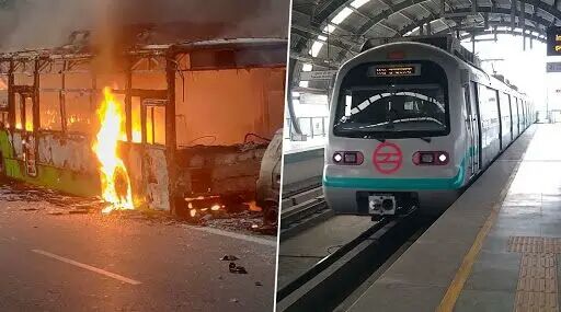 DTC bus set ablaze and Delhi Metro. (Photo Credit: Twitter/DMRC)