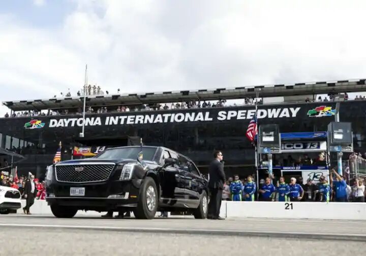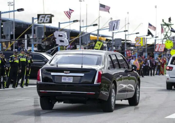 The presidential limousine known as “The Beast,” with President Donald Trump aboard, takes a lap before the start of the NASCAR Daytona 500 auto race at Daytona International Speedway, Sunday, Feb. 16, 2020, in Daytona Beach, Fla. (AP Photo/Alex Brandon)