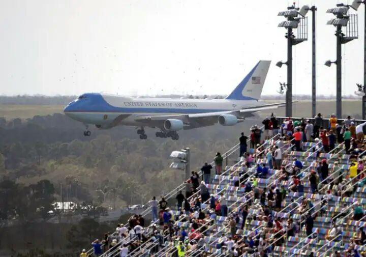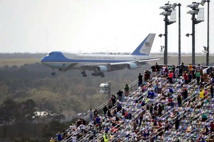 Fans watch from the grandstands as Air Force One, carrying President Donald Trump, prepares to land at Daytona International Airport before the NASCAR Daytona 500 auto race at Daytona International Speedway, Sunday, Feb. 16, 2020, in Daytona Beach, Fla. President Trump is scheduled to visit India on February 24-25. (AP Photo/Phelan M. Ebenhack)