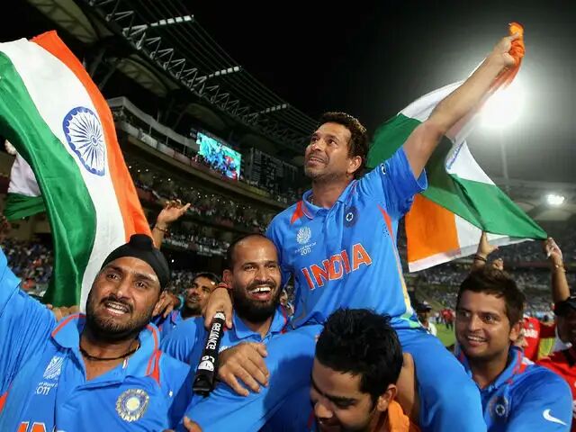 Gautam Gambhir slammed 97 runs off 122 balls while skipper Dhoni scored an unbeaten 91 as India chased down the target of 275 runs with ten balls to spare in the final to lift the coveted trophy. Indian team players carried Sachin on their shoulders across the Wankhede Stadium after the final as the crowd cheered on.