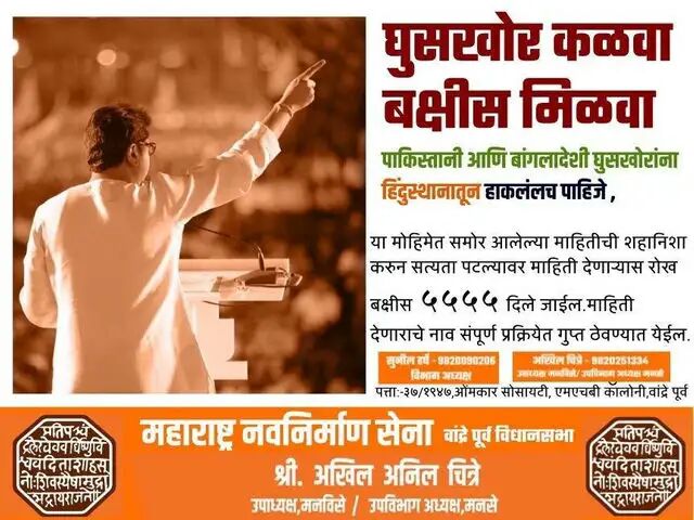 “Here, in Bandra East there are several illegal immigrants and we, the Maharashtra Navnirman Sena, beseech people to provide accurate information on such people. As a token of appreciation, we will give them Rs 5555. Where the police can’t reach, we MNS will reach and do the job,” Chitre can be heard saying in a video shared on social media.
