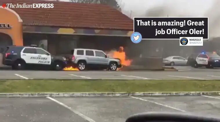 A New Jersey police officer is being hailed as a hero after his quick reaction to a fire incident saved a restaurant from burning down. In a video, tweeted by the official account of Stafford Police, the officer can be seen pushing an ignited car away from the building in order to prevent the fire from spreading.